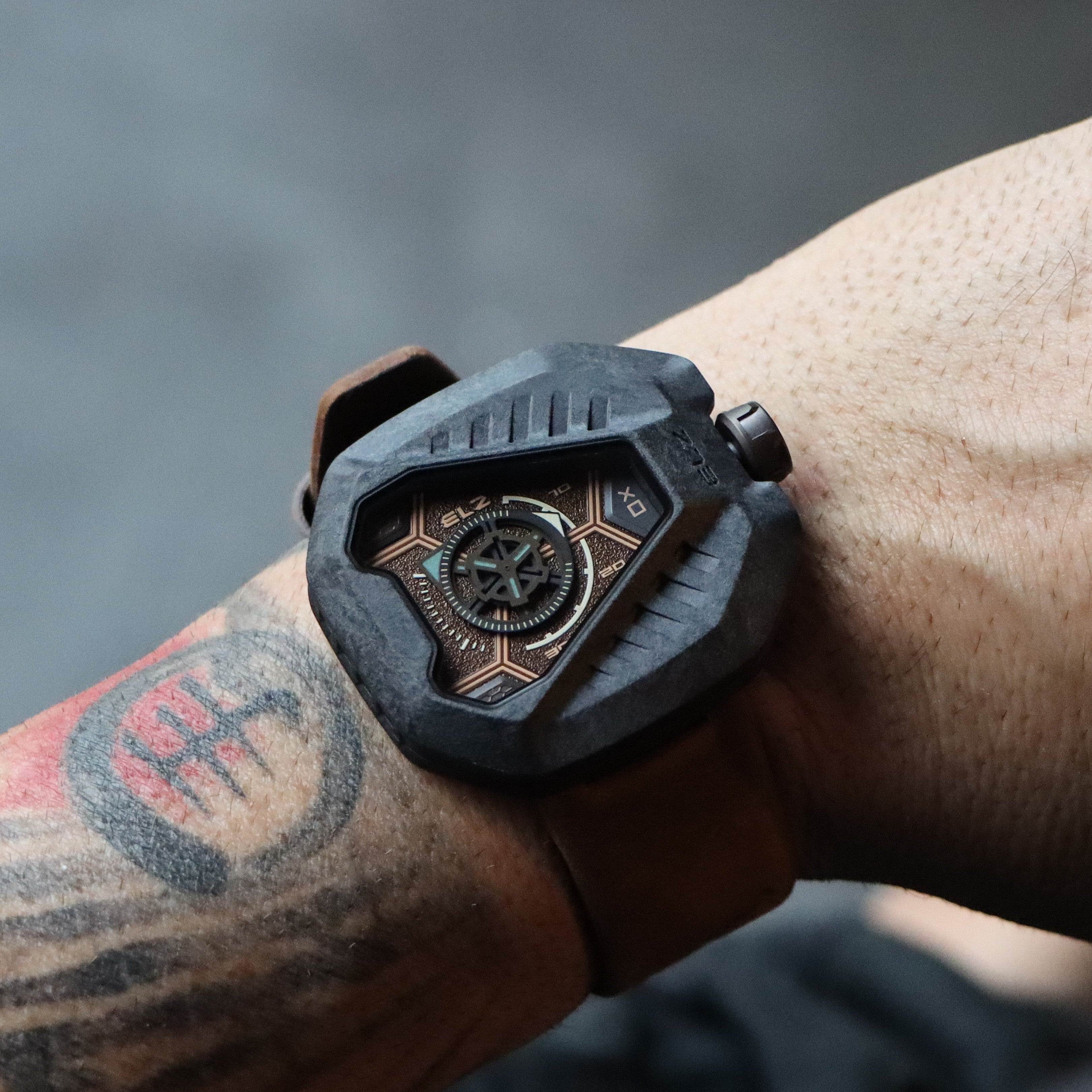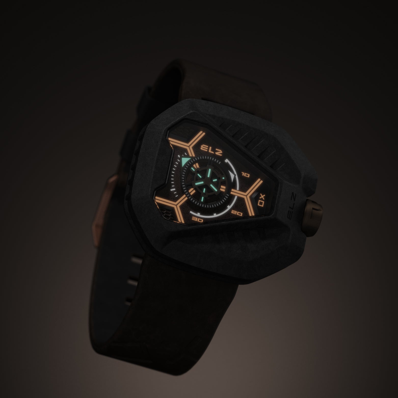 The XO Terra Edition channels the spirit of Steampunk visionaries, blending intricate mechanical detailing with a cutting-edge twist. Its carbon-injected case and multi-layered dial echo the raw beauty of planetary gearwork, paying homage to our mechanical roots while pushing toward the next millennium. Under black light, Swiss Super-LumiNova unveils its secret glow—an ode to retro-futurism and the pioneers of tomorrow.