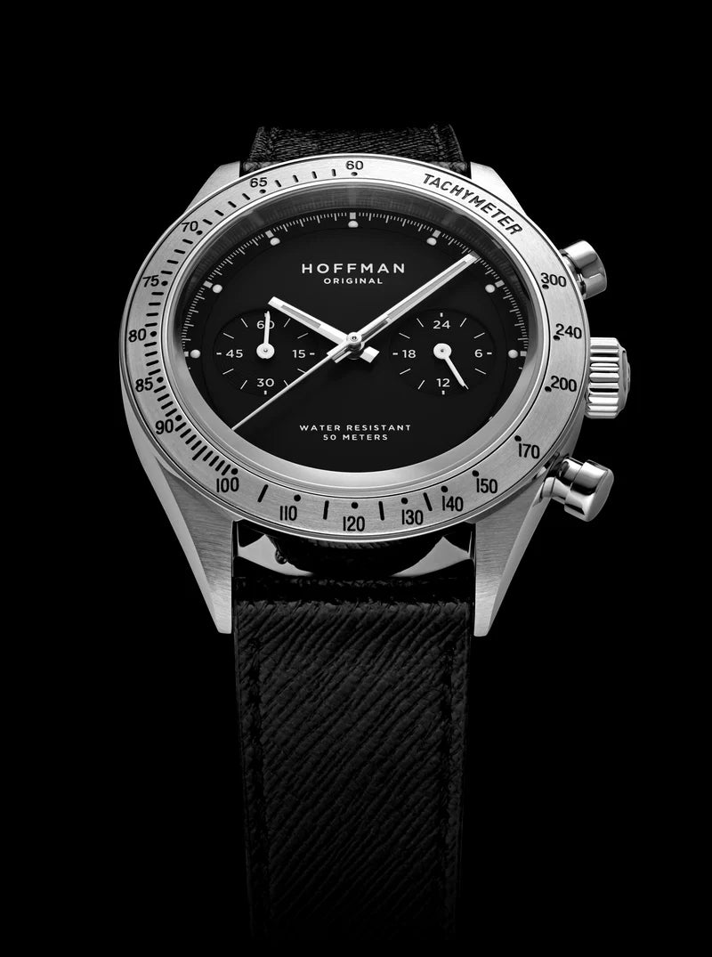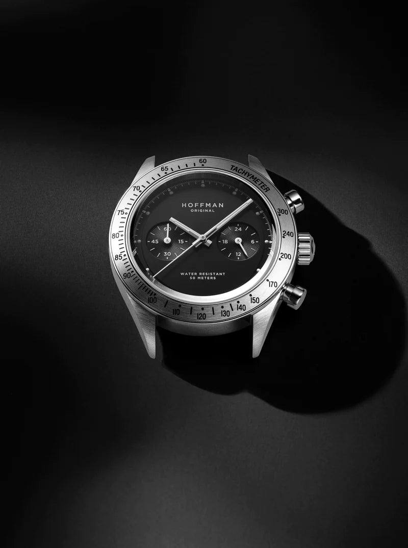 Introducing the new Racing 40 Jet Black, a monochrome racing chronograph with a design that balances vintage style and modern elements. The Jet Black is presented in a polished and brushed steel case, complemented by a brushed steel bezel with an engraved tachymetric scale. The deep black dial is dual-layered, and embossed circular patterns accentuate the sub-dials and add a touch of texture and distinction. The sub-dials display stopwatch minutes at 9 o'clock and 24-hour time at 3 o'clock. The watch is fitted with an elegant black saffiano strap, lending an air of refinement.