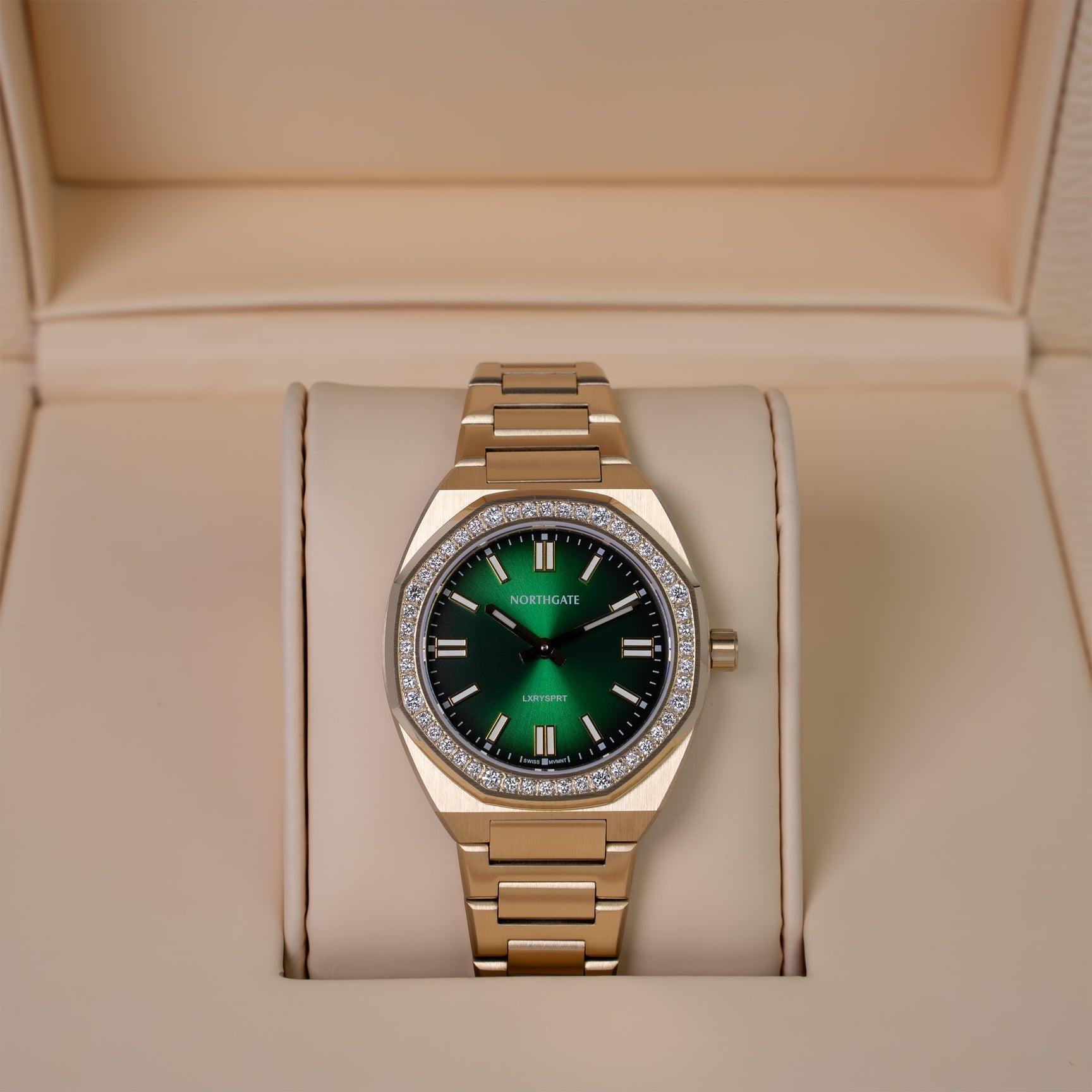 Discover the rare fusion of modern technology and timeless craftsmanship with the Northgate Club Diamond Gradient Green Champagne Gold. This exceptional timepiece is adorned with 48 original lab-grown, round brilliant-cut diamonds, each precision-set to reflect elegance from every angle. Eight prominent diamonds anchor the octagonal diamond-set dial, creating a striking visual symmetry that draws attention instantly.
