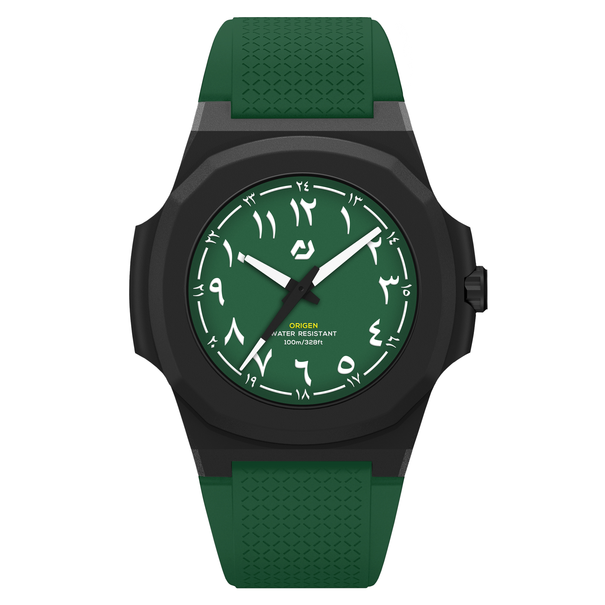 • The dial is embellished with Arabic calligraphy .