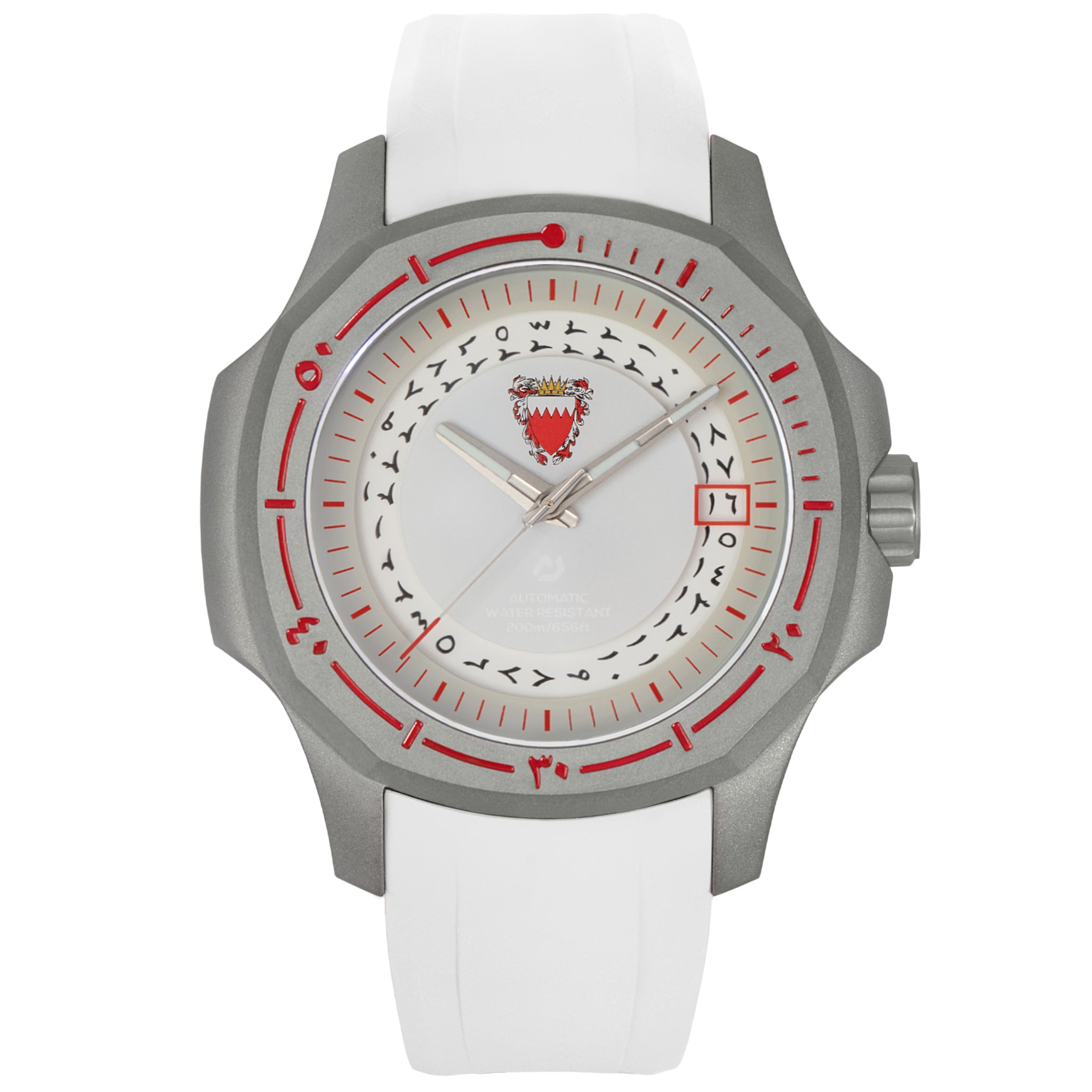 The sapphire crystal anti-scratch glass showcases the intricate Bahrain Emblem on the dial, a tribute to the country's identity. Swiss BGW9 Luminous hands illuminate the path forward, driven by the reliable Seiko cal.NH35A Automatic movement. The watch seamlessly blends functionality with style, featuring a date wheel that elegantly rotates based on the day. With red and white Caoutchouc Rubber straps, representing the national colors, and a 316L Stainless Steel buckle, this timepiece is not just a watch; it's a statement of Bahraini pride. Water-resistant up to 20atm, or 200m, it embodies the resilience and depth of the Bahraini spirit, making it a fitting companion for both land and sea.
