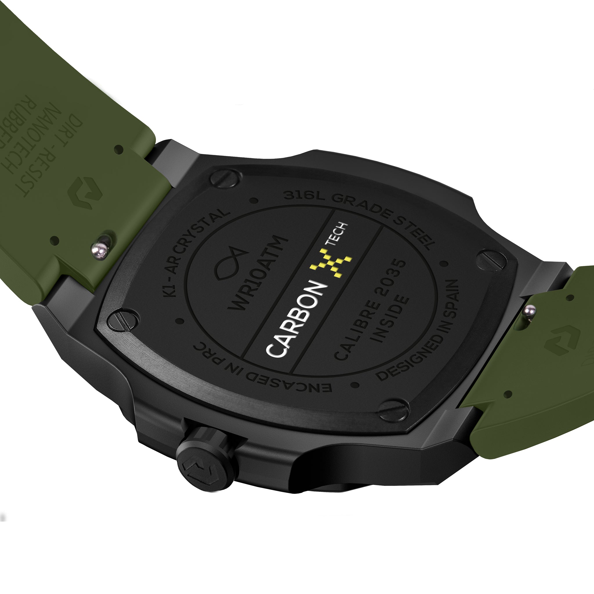 At the heart of this watch, lies the robust and sleek Carbon X Tech case, meticulously crafted to stand the test of time. Measuring 40.5mm by 47mm, the case promises a presence on the wrist that is both commanding and elegant. This watch is perfectly complemented by a high-performance Nanotech dirt resist-rubber strap in black, designed to withstand the rigors of daily adventures while maintaining a pristine look.