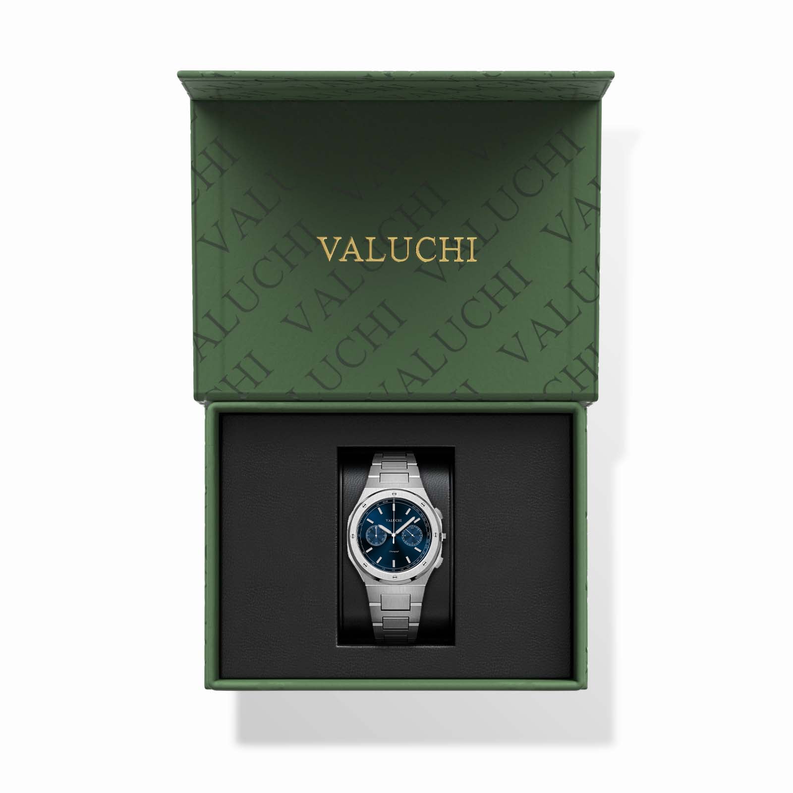 As with all VALUCHI timepieces, the Silver Blue Chronograph is powered by the reliable Japanese Seiko Quartz Movement, offering accurate timekeeping. The durable 316 stainless steel bracelet in silver complements the modern aesthetic of the watch, and interchangeable straps provide the flexibility to switch up your style.