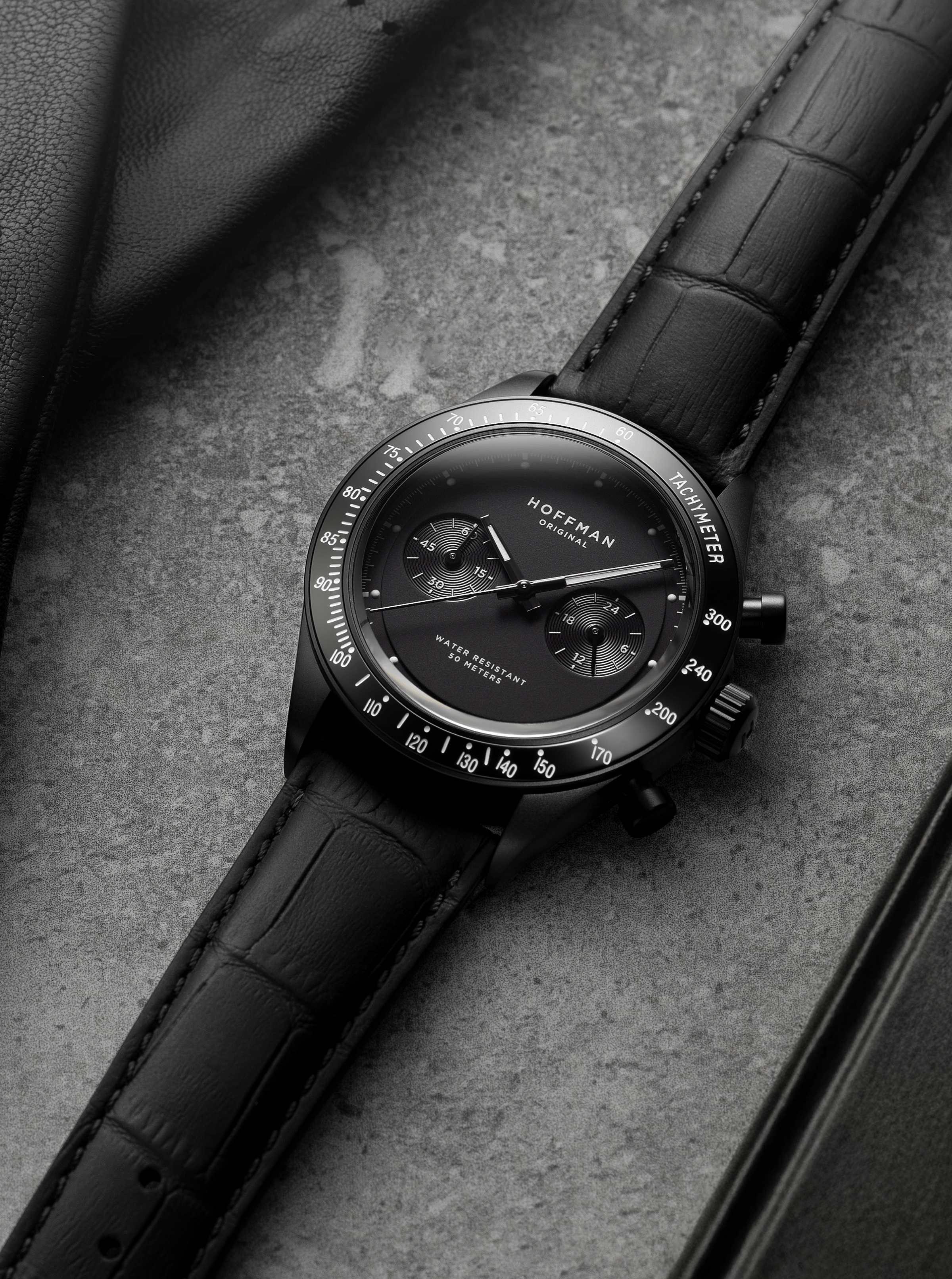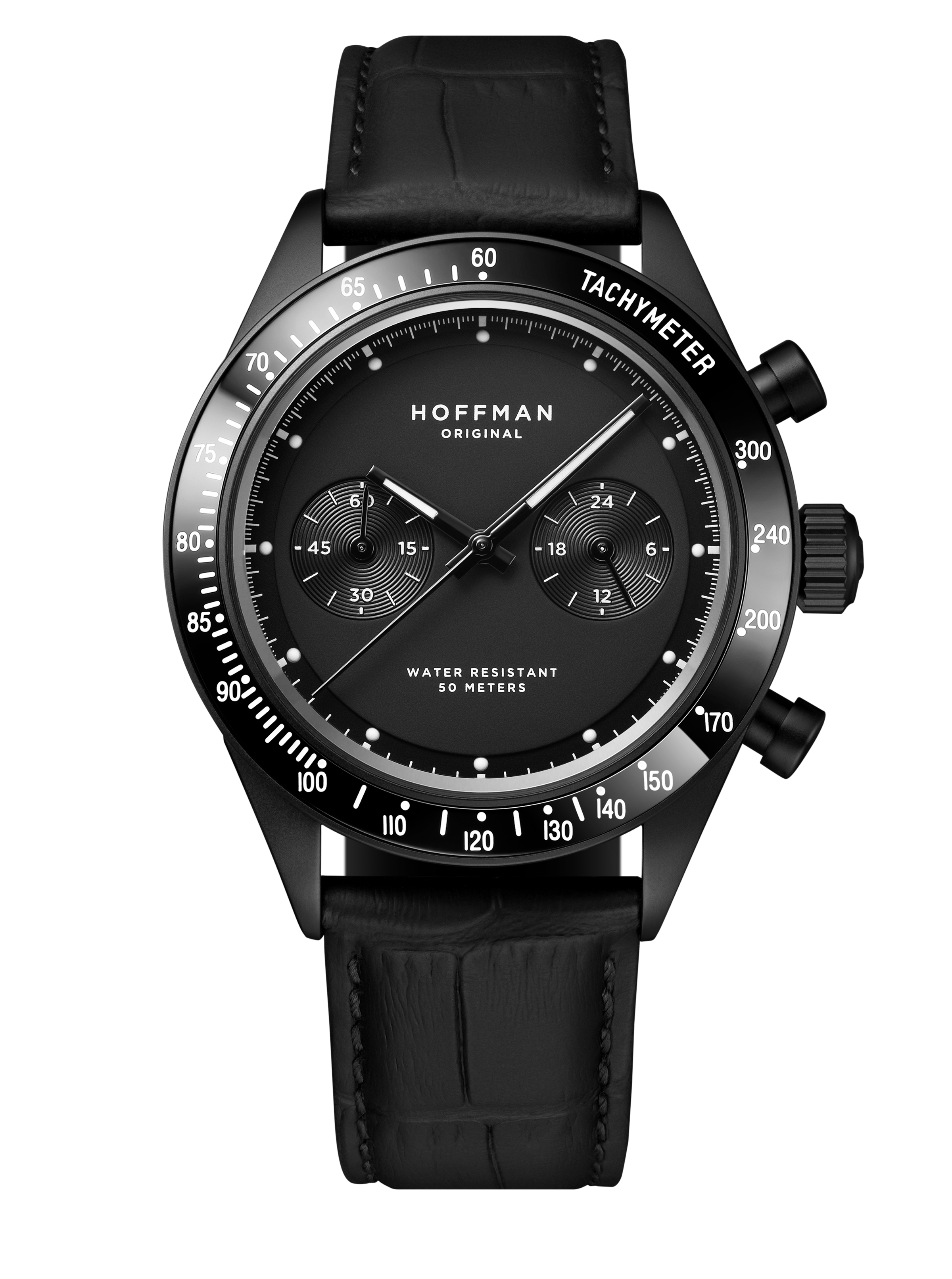 The matte black case is paired with a matte black leather strap, and contrasted by polished tachymeter bezel and hands.