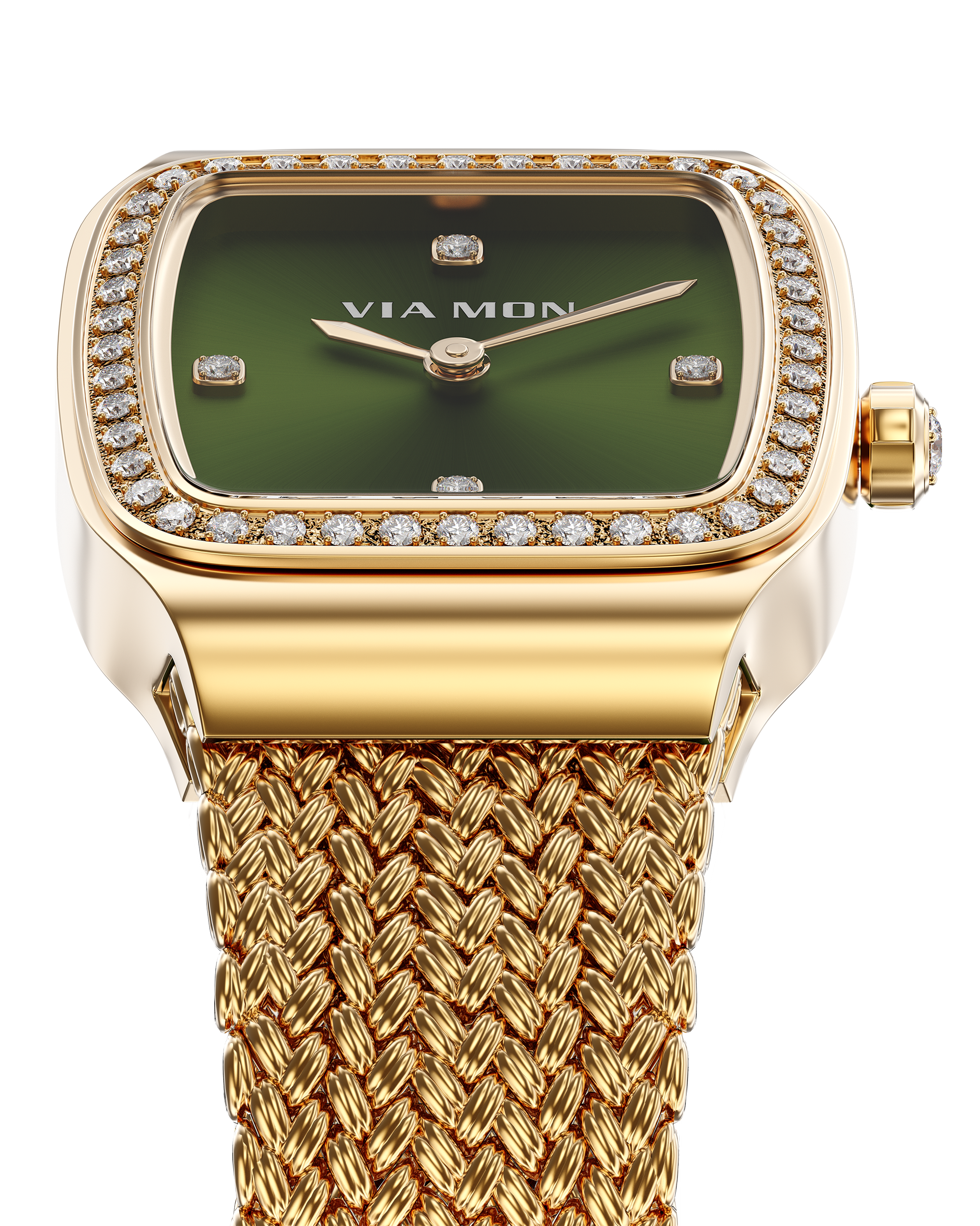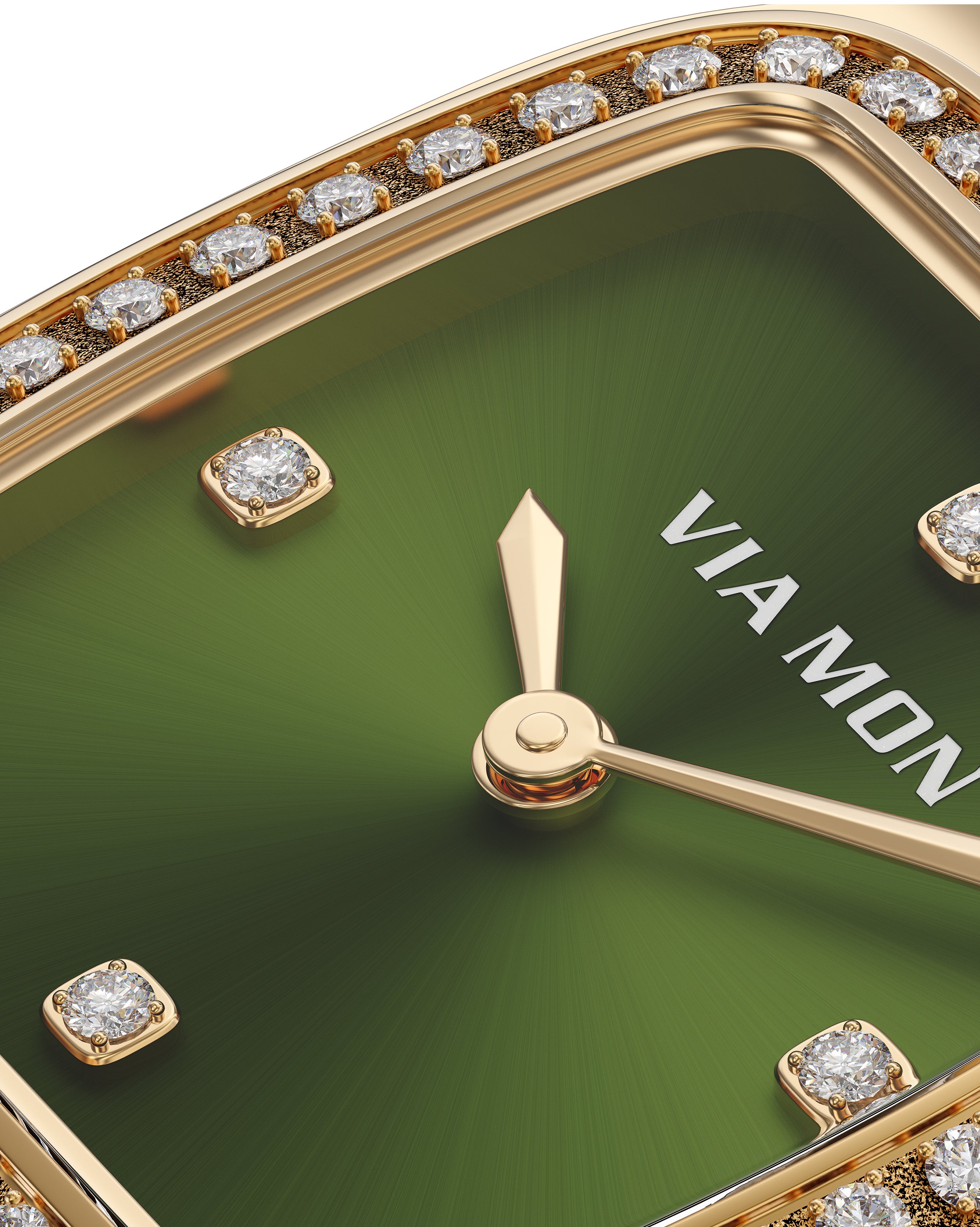 The Novia Green Full Diamond is a celebration of modern femininity, designed for women who embrace elegance with a bold, vibrant spirit. Its deep green mother-of-pearl dial captures the light in shifting tones, offering a rich visual depth unmatched in its class. Jewel-set markers at 12, 3, 6, and 9 o’clock highlight the dial with sparkling sophistication.