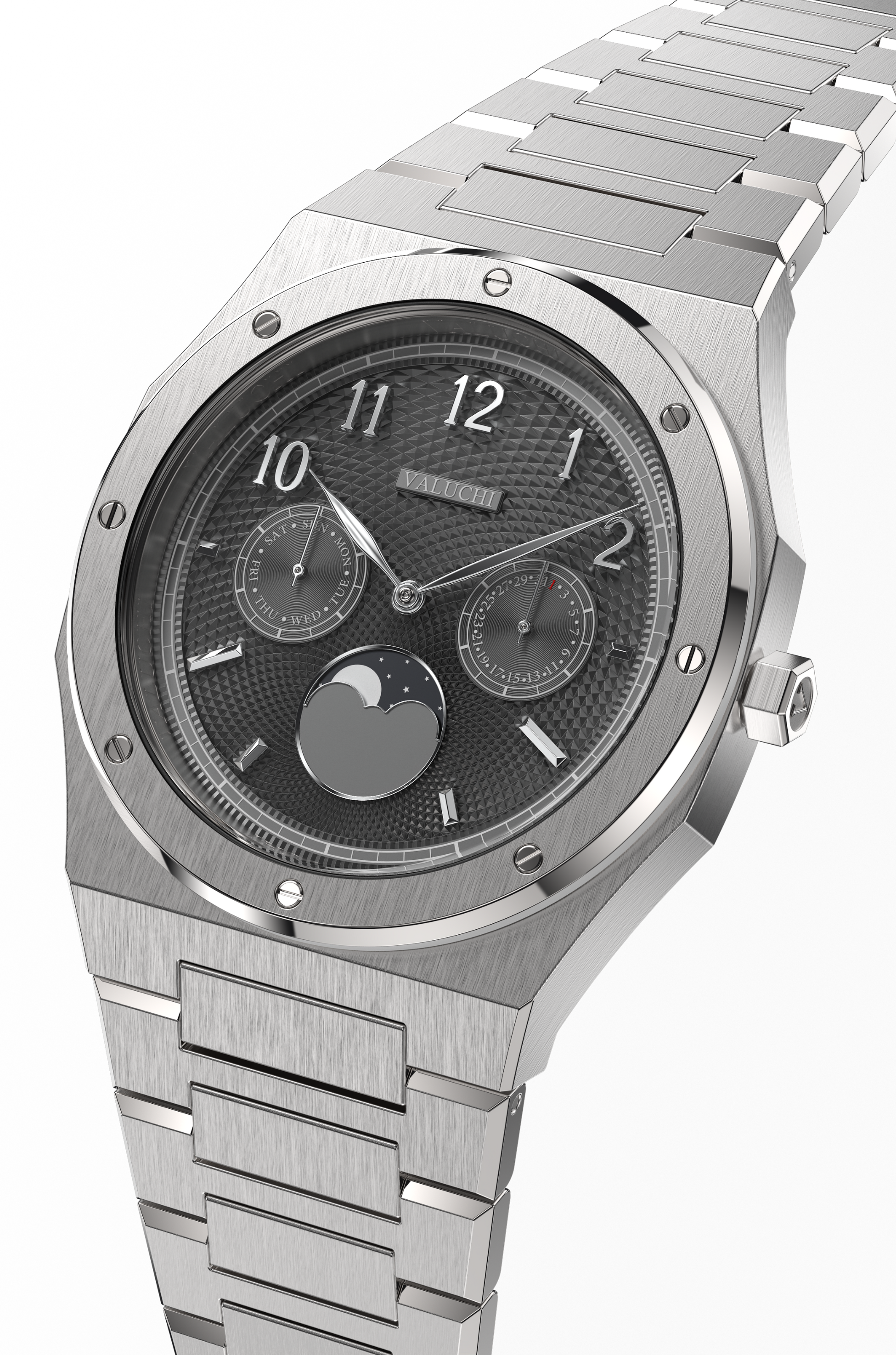 A modern expression of classic elegance, the VALUCHI Dual Calendar in Stainless Steel 316L offers a bold and distinctive presence on the wrist. Designed in Amsterdam and engineered with the same precision and quality as VALUCHI limited editions, this timepiece features a rich black dial with a geometric pattern that plays with light and shadow.