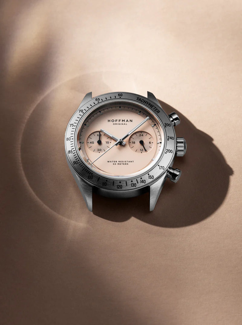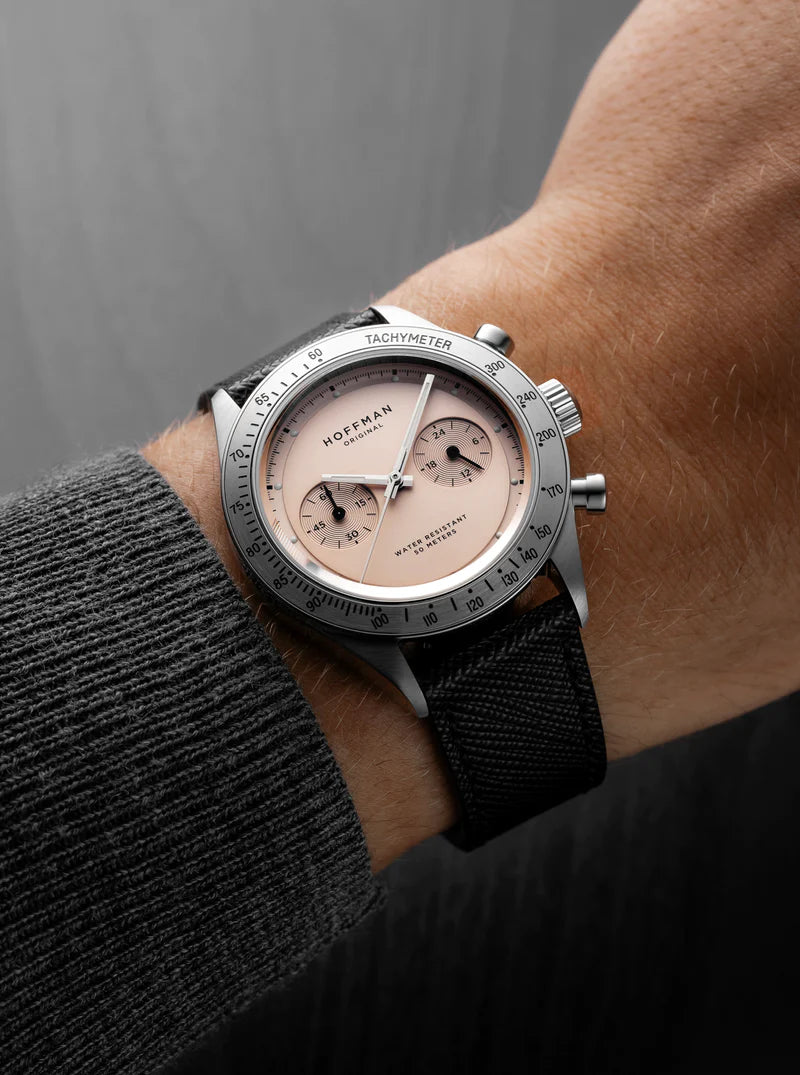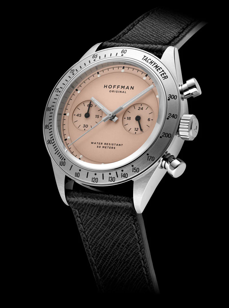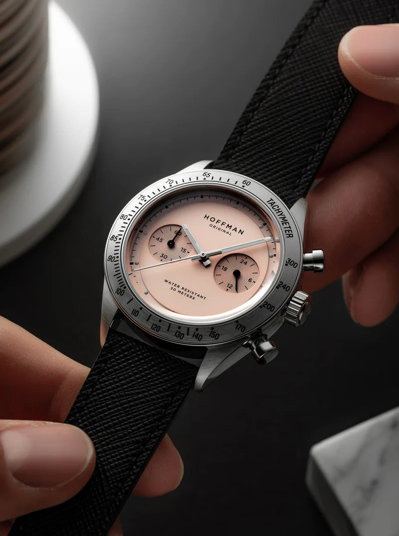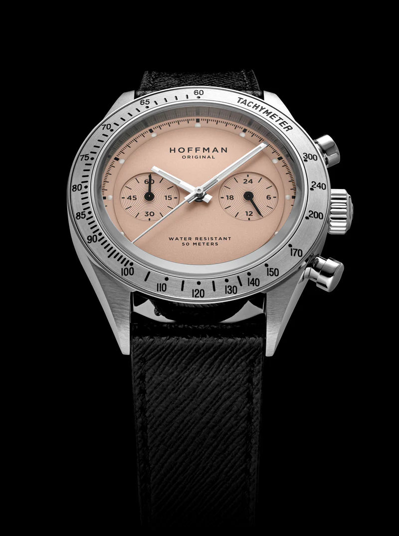 The SLMN is presented in a polished and brushed steel case, complemented by a brushed steel bezel with an engraved tachymetric scale. The dial, with its dual layers, is rendered in striking salmon hues. Embossed circular patterns accentuate the sub-dials and add a depth to the design. The sub-dials display stopwatch minutes at 9 o'clock and 24-hour time at 3 o'clock. The watch is fitted with an elegant black saffiano strap, providing a touch of refinement.