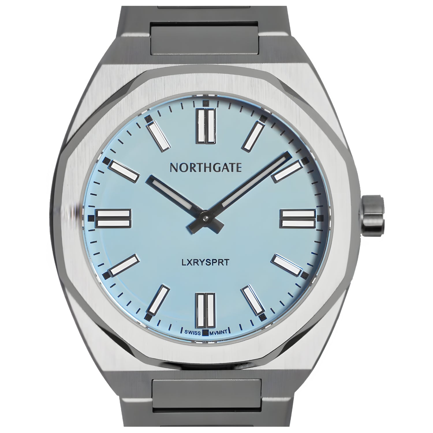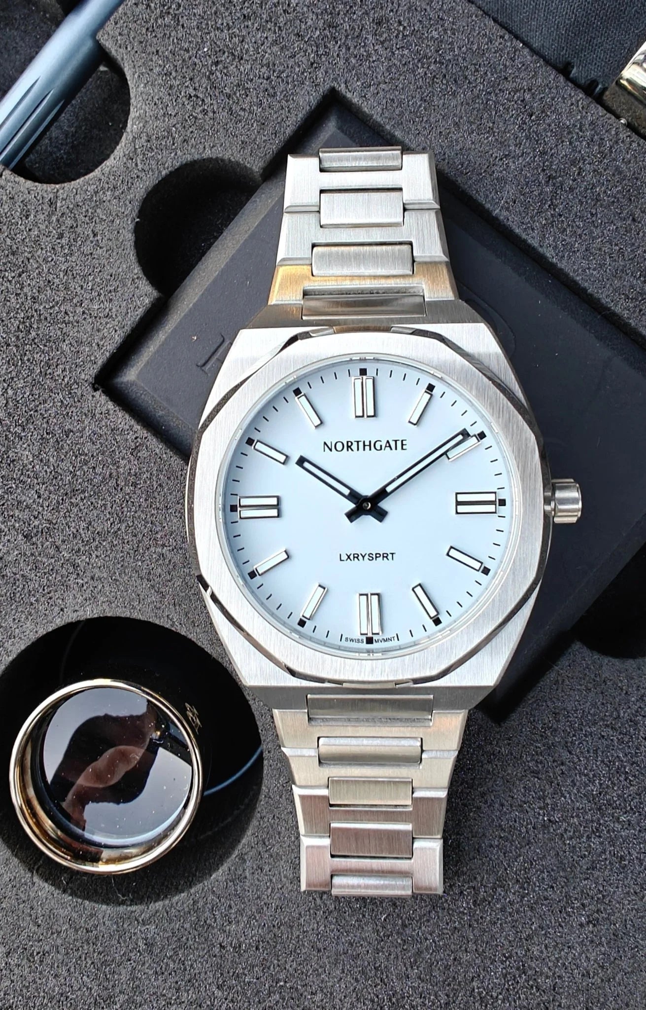 • Stainless Steel integrated bracelet with butterfly clasp (We added a special Northgate tool and extra links for easy adjustment of the bracelet)