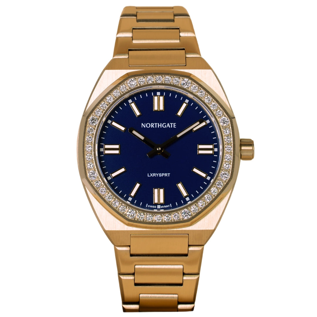 Discover the rare fusion of modern technology and timeless craftsmanship with the Northgate Club Diamond Royal Blue Champagne Gold. This exceptional timepiece is adorned with 48 original lab-grown, round brilliant-cut diamonds, each precision-set to reflect elegance from every angle. Eight prominent diamonds anchor the octagonal diamond-set dial, creating a striking visual symmetry that draws attention instantly.