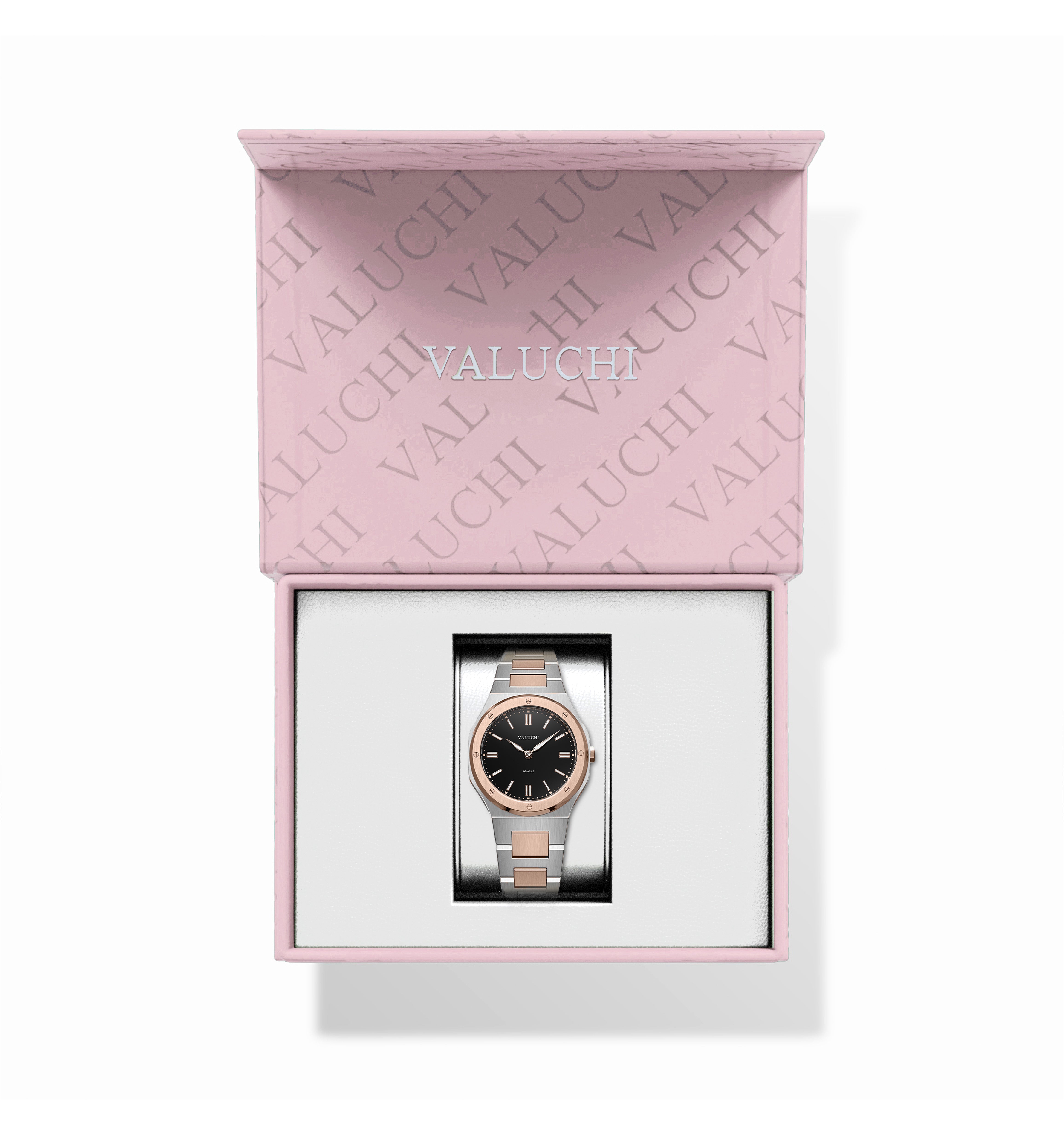 For her, the Signature Bicolor Black VALUCHI - 31mm captures the essence of sophistication and boldness. The elegant bicolor case perfectly complements the striking black dial, creating a beautiful contrast that radiates luxury and refinement. With its 31mm size, this timepiece offers a timeless blend of style and practicality, making it the perfect addition to any collection. Whether for a formal event or an everyday touch of elegance, this watch enhances every moment.