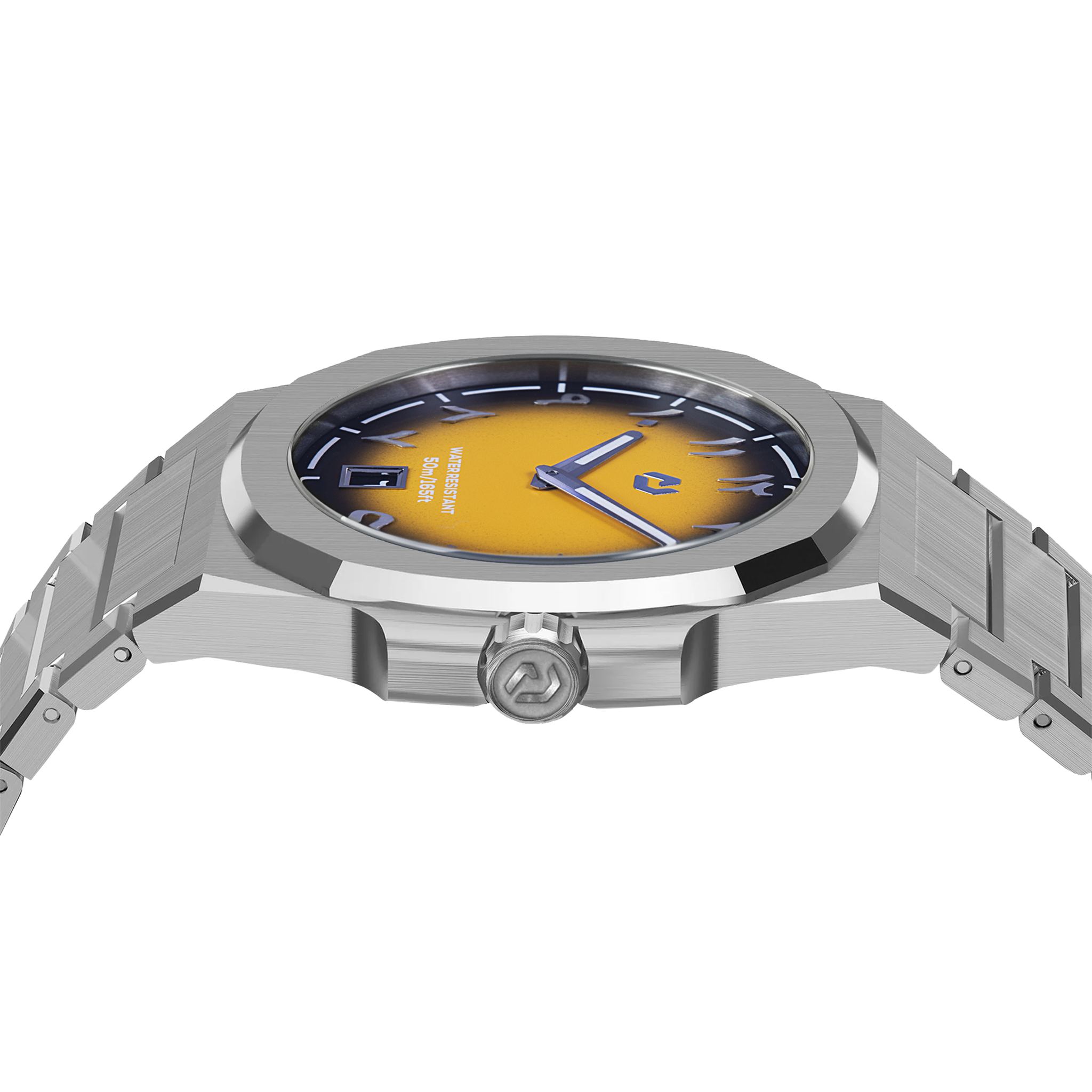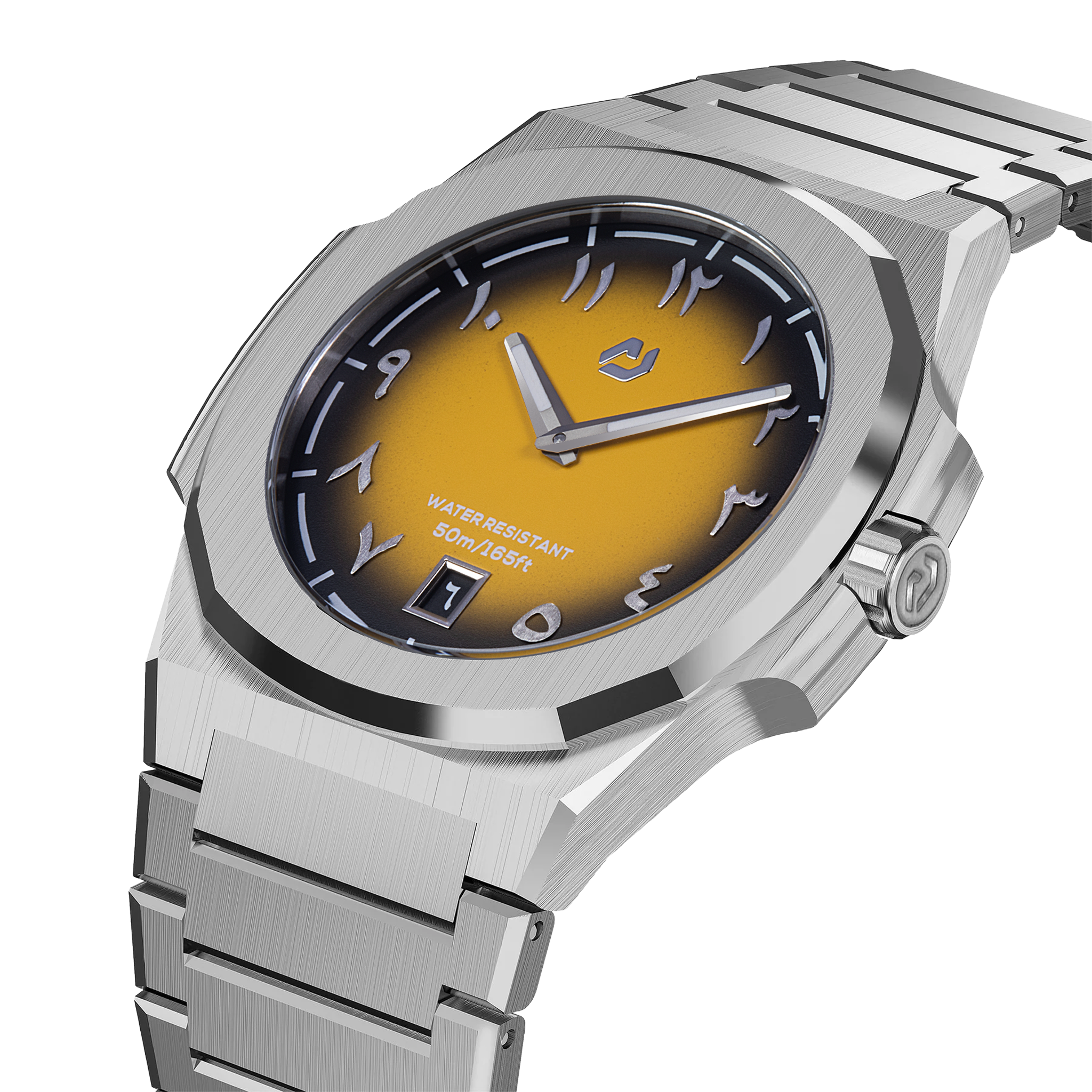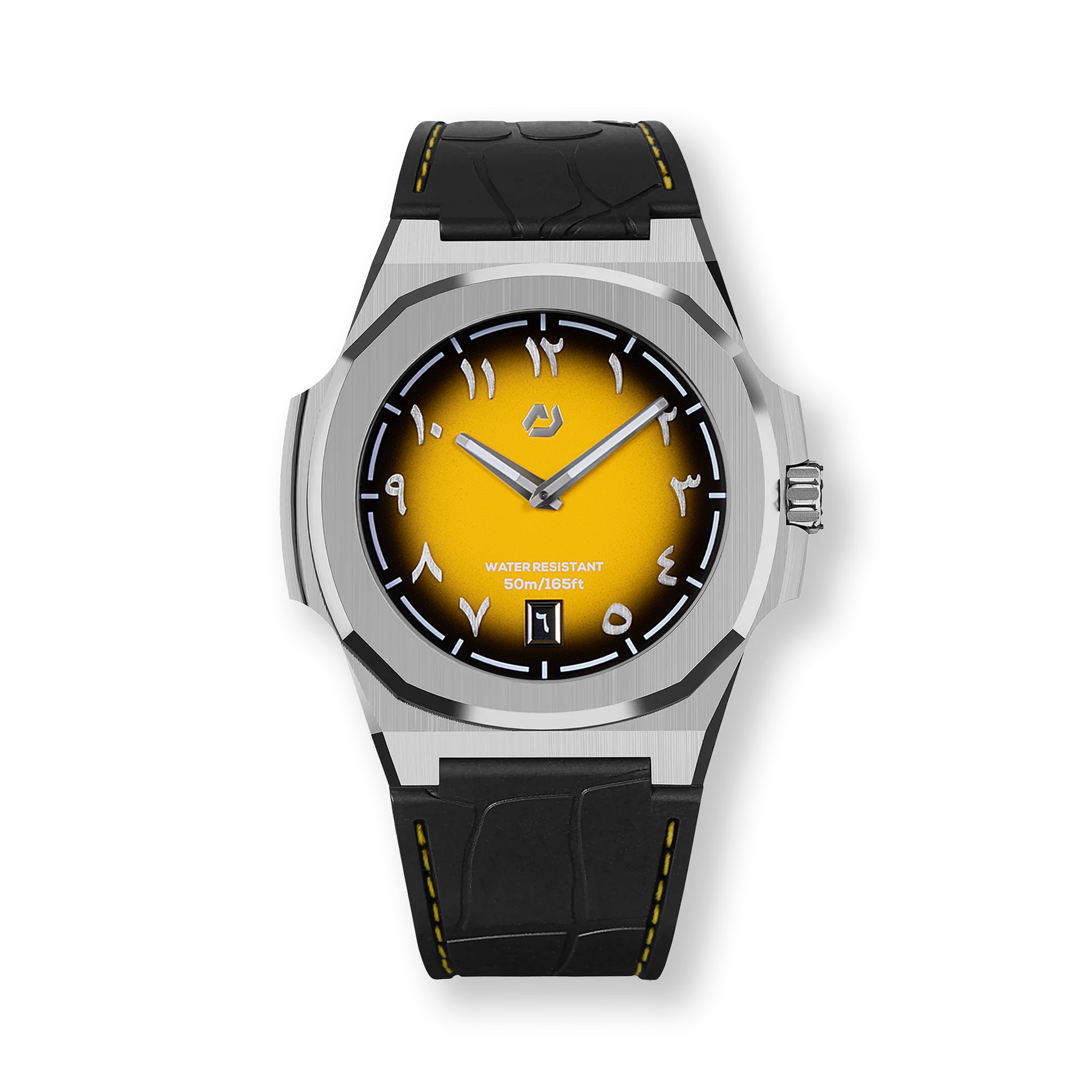 At the heart of this watch lies a bold gradient dial — transitioning from LT’s signature yellow at the center to deep black at the edges — representing a radiant journey from beginnings to brilliance. Arabic numerals and brushed steel hands ensure legibility with a cultural touch. The Anniversary Edition comes with two interchangeable straps::